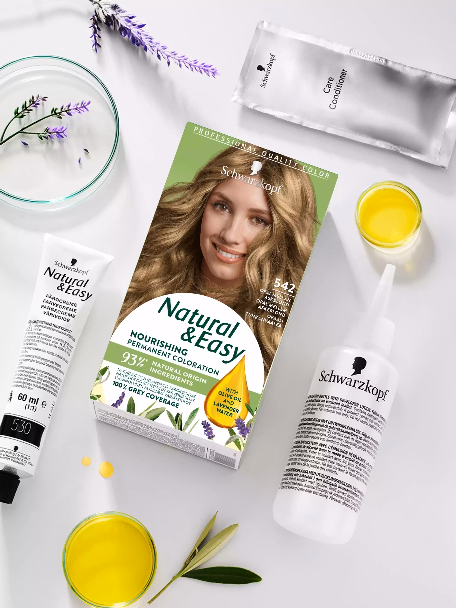 Schwarzkopf Natural & Easy Hair Color -542 Askblond er en hårfarge serie fra Schwarzkopf, er elsket for det naturlige og uttrykksfulle fargeresultatet. Den gir håret ditt naturlig hårfarge og gir den ekstra glans. Fargekremen er beriket med næringsrikt fransk lavendelvann, og inneholder 3 ferdigblandede nyanser for et naturlig, uttrykksfullt resultat som dekker opptil 100% grått hår.