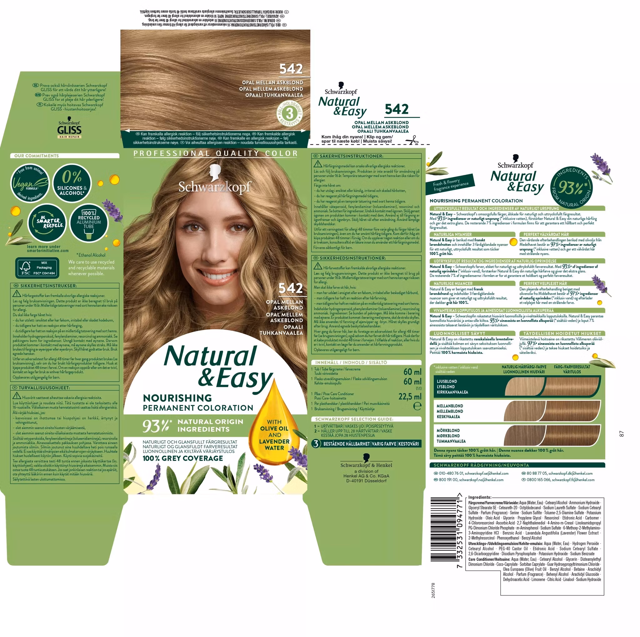 Schwarzkopf Natural & Easy Hair Color -542 Askblond er en hårfarge serie fra Schwarzkopf, er elsket for det naturlige og uttrykksfulle fargeresultatet.