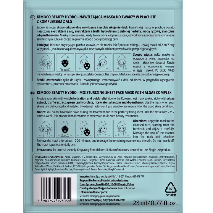 Kimoco beauty mask Hydro- Algae Complex Sheet Mask gir rask hydrering og lindring. Masken passer til tørr hud, dehydrert og irritert hud.